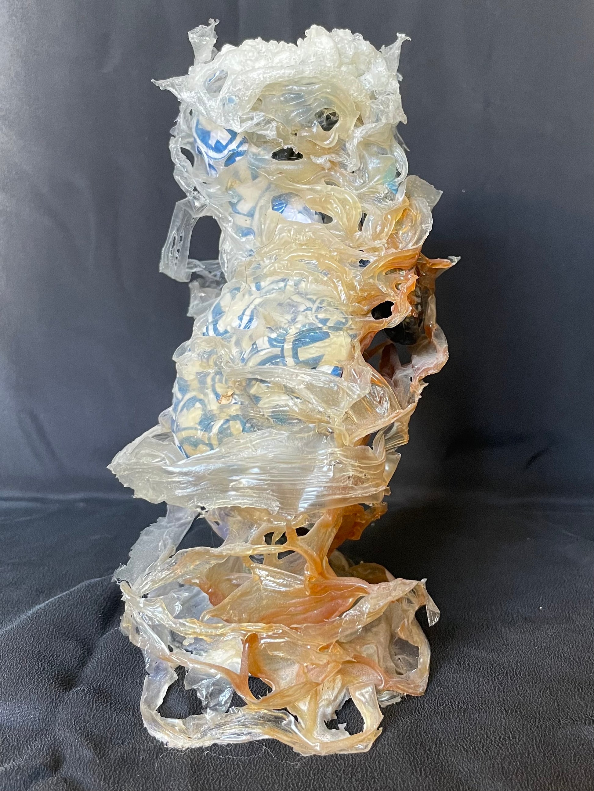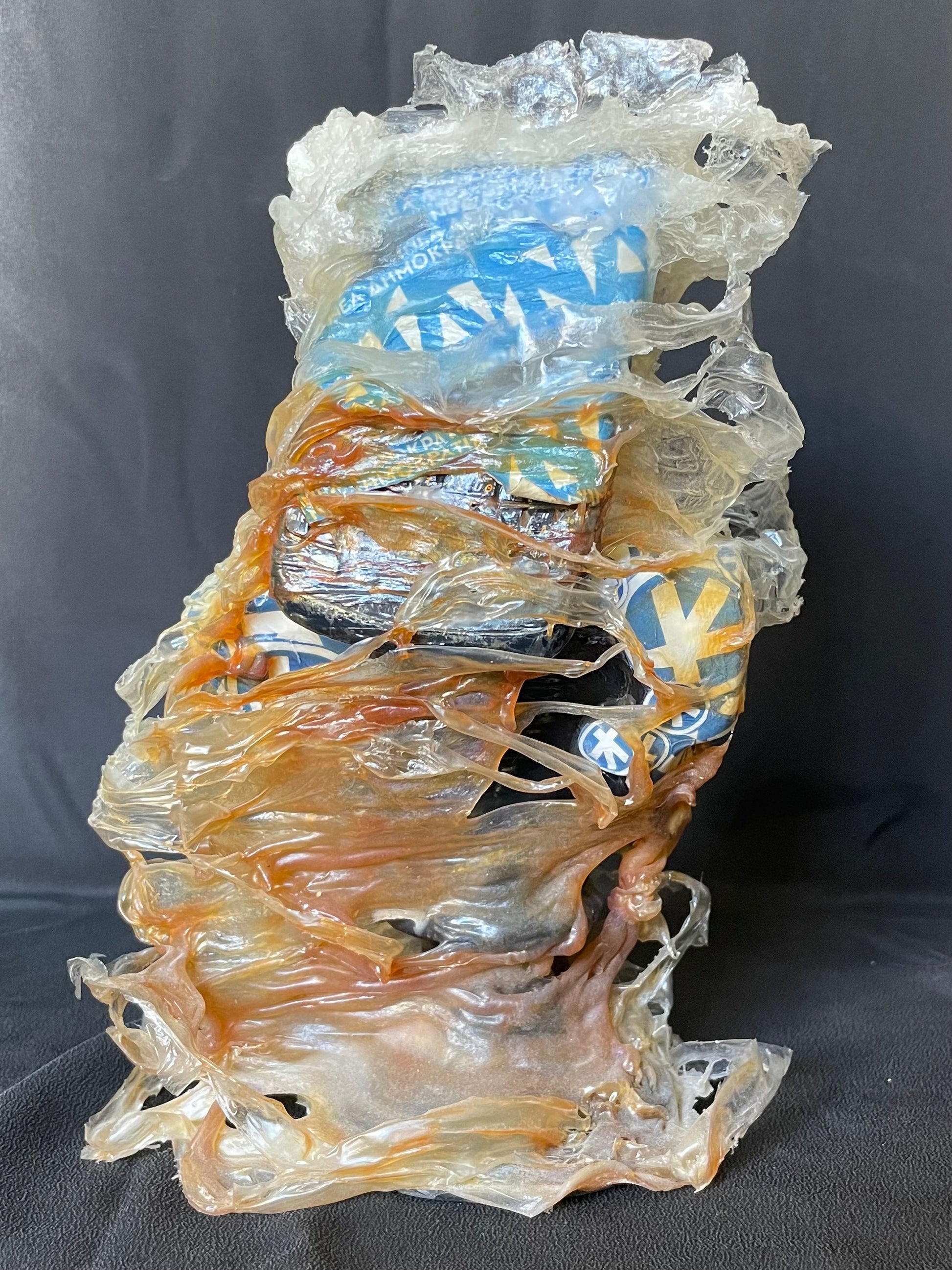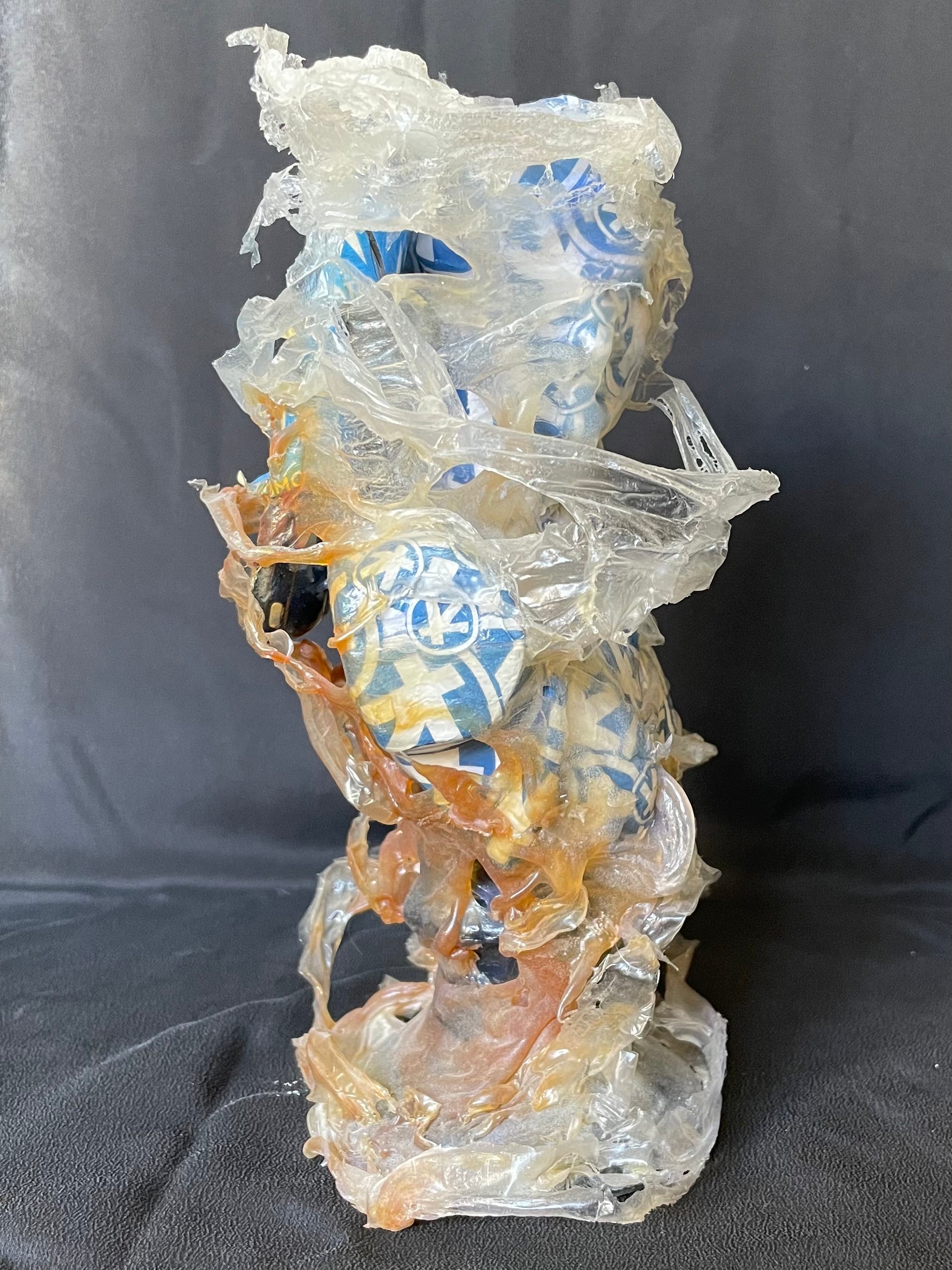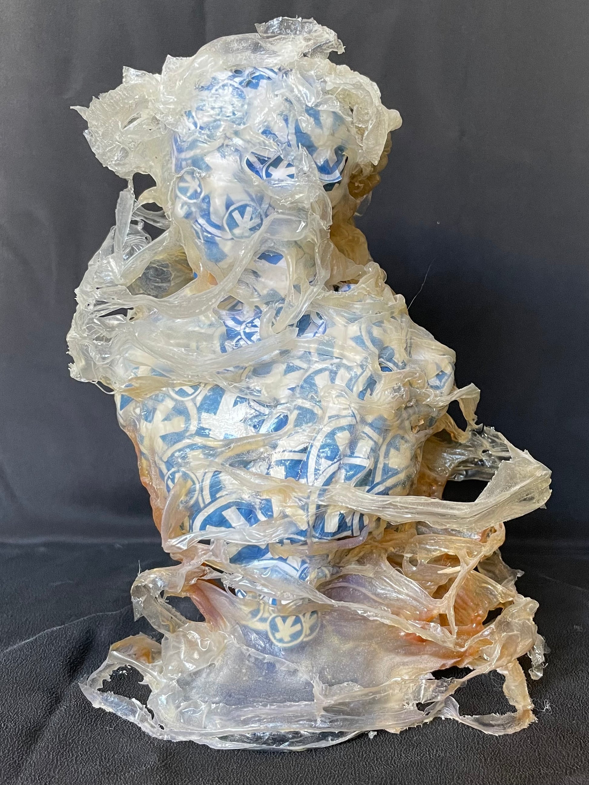 The project focuses on the two statues # 7 and # 8. # 7 is the largest and is made of marble paste, # 8 is plaster and concrete. Both are painted in black acrylic paint and covered with tape belonging to political parties and banks. They are coated with vinyl resin and wrapped in spirals of glue mixed with mineral powders. They represent the possible evolutions of humanity from the classical age (both are Greek gods: # 7 is Persephone and # 8 is Antigone) up until the modern era.