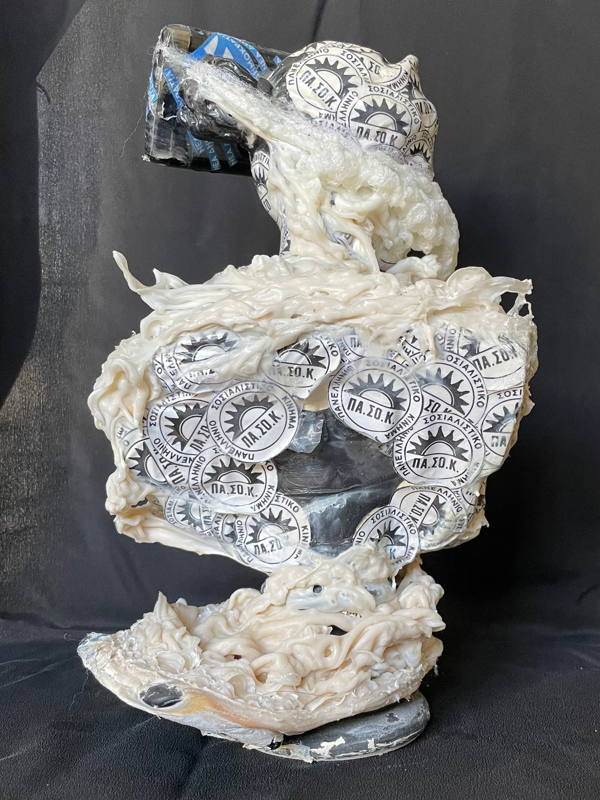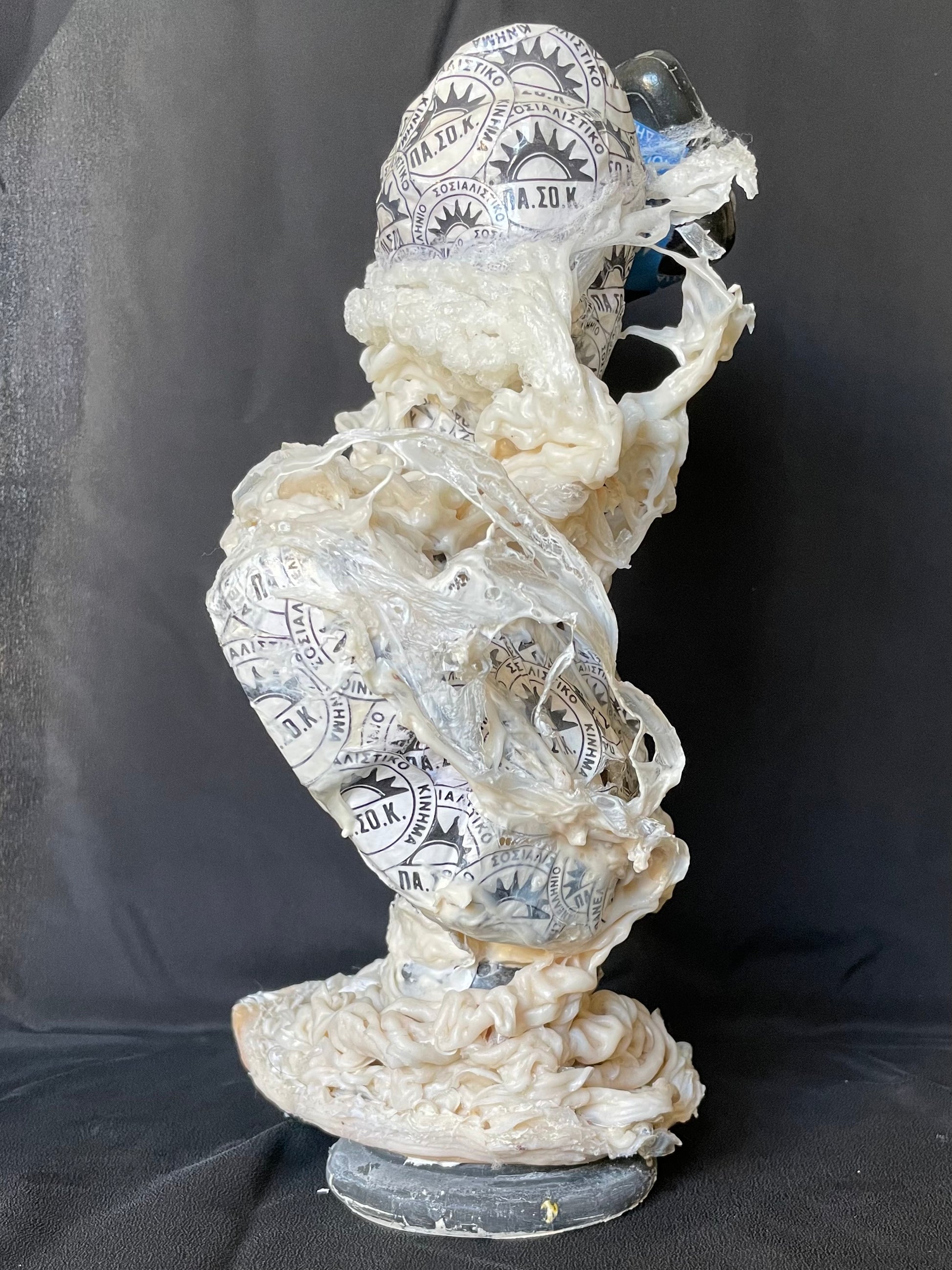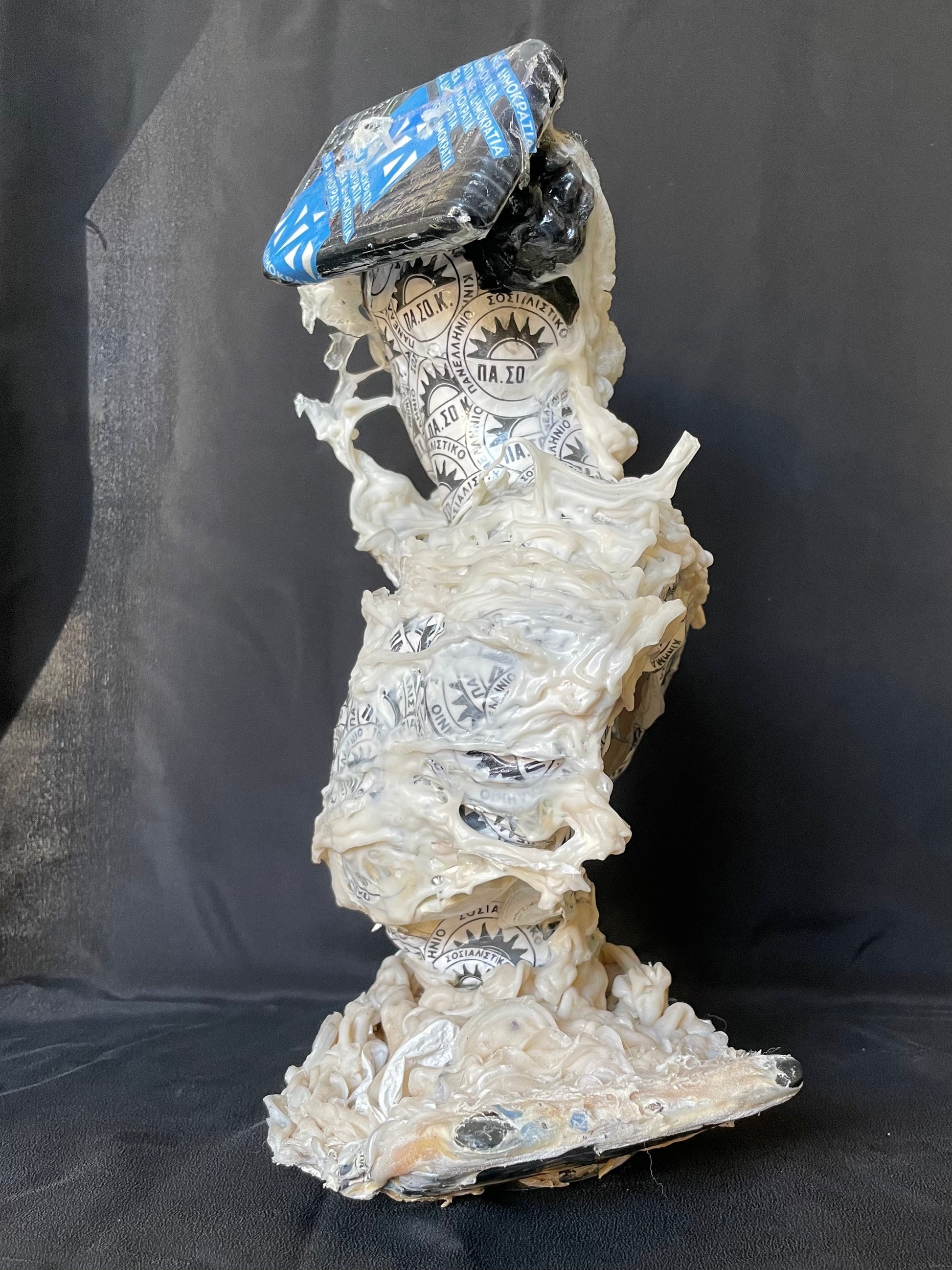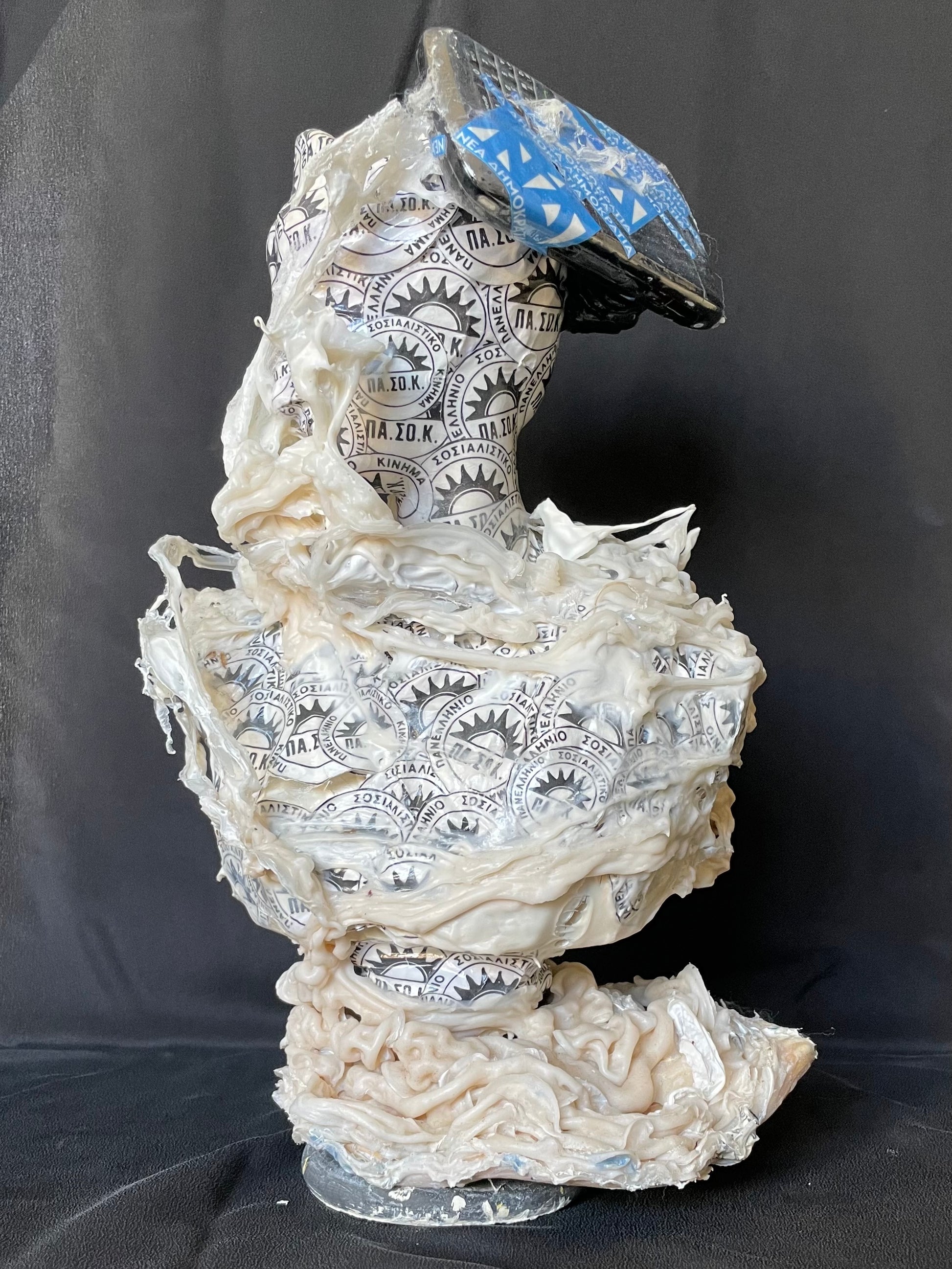 The project focuses on the two statues # 7 and # 8. # 7 is the largest and is made of marble paste, # 8 is plaster and concrete. Both are painted in black acrylic paint and covered with tape belonging to political parties and banks. They are coated with vinyl resin and wrapped in spirals of glue mixed with mineral powders. They represent the possible evolutions of humanity from the classical age (both are Greek gods: # 7 is Persephone and # 8 is Antigone) up until the modern era.