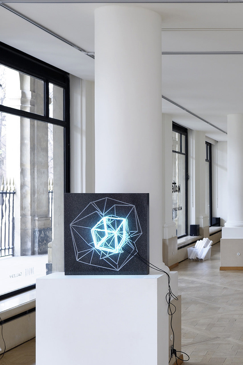 In the work CUBO DI GABO, Gabriele Dal Dosso approaches various materials such as wood, volcanic stone from Vesuvius, Carraramarble and neon tubes, to concretize a 2D transposition of his works. At the same time, he looks to 3D printing as a sculpture, a perfect reproduction of his studies in a limited editions.