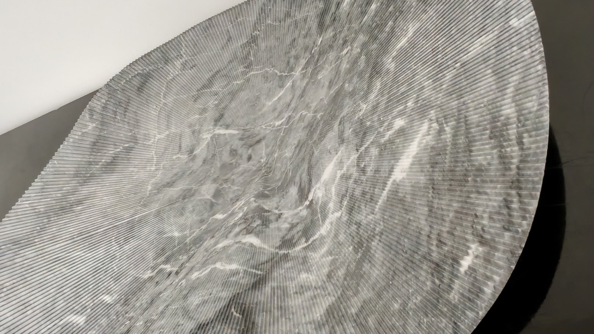 This centerpiece is enhanced by a distinctive striated finish with variable depth, characterized by a radial pattern where all lines converge towards a single central point.