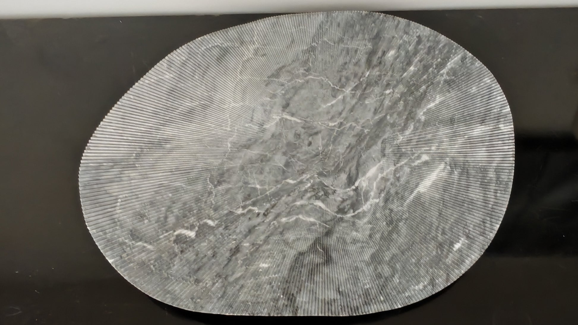 Ce centre de table est mis en valeur par une finition striée particulière, à profondeur variable, caractérisée par un motif radial dans lequel toutes les lignes convergent vers un point central unique.